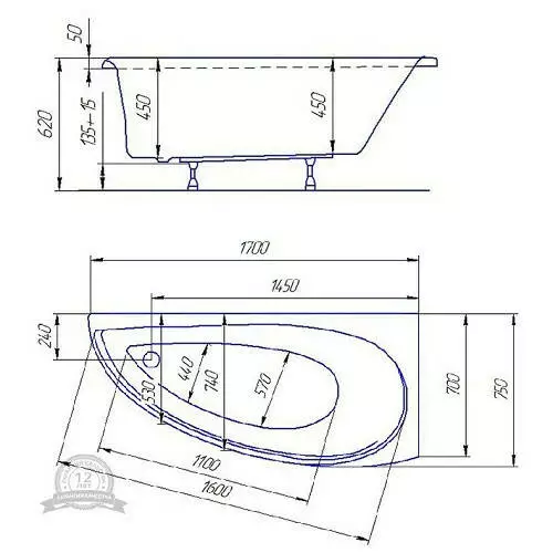 - Форма ванны: Асимметричная